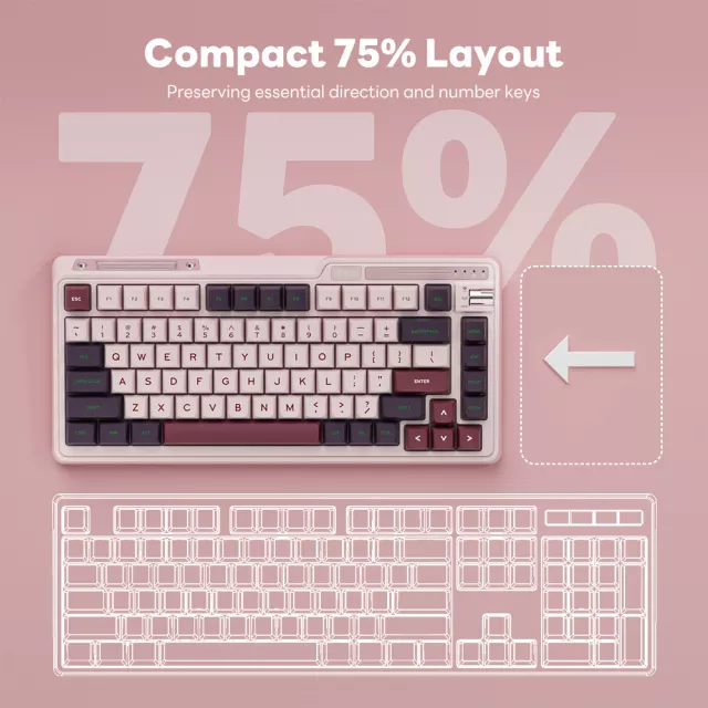 Take your typing and gaming to the next level with this compact 75% mechanical keyboard. Designed for those who crave both performance and aesthetics, it delivers a smooth, satisfying typing experience in a space-saving form. Its vibrant RGB backlighting and advanced tri-mode connectivity make it the perfect companion for work, play, and everything in between.