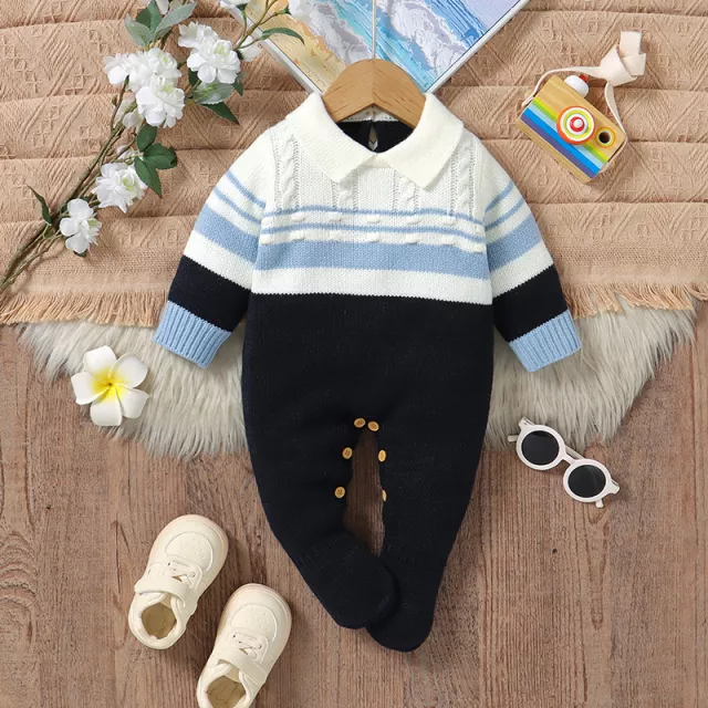 Keep your baby boy cozy and cute this season with our Cozy Knit Baby Romper. Designed with care and comfort in mind, this adorable striped jumpsuit wraps your little one in warmth from head to toe. The soft acrylic knit fabric feels gentle against delicate skin, while the breathable design ensures comfort during playtime, naptime, or outdoor strolls. With its charming turn-down collar and pullover style, dressing your baby has never been easier—or more stylish.