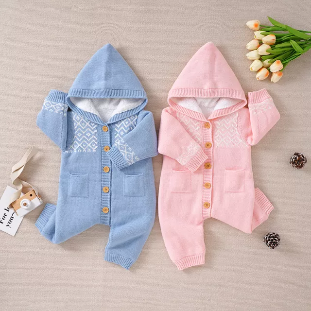 Cozy Winter Knitted Baby Romper with Hood – Unisex Long Sleeve Onesie 0-18M
