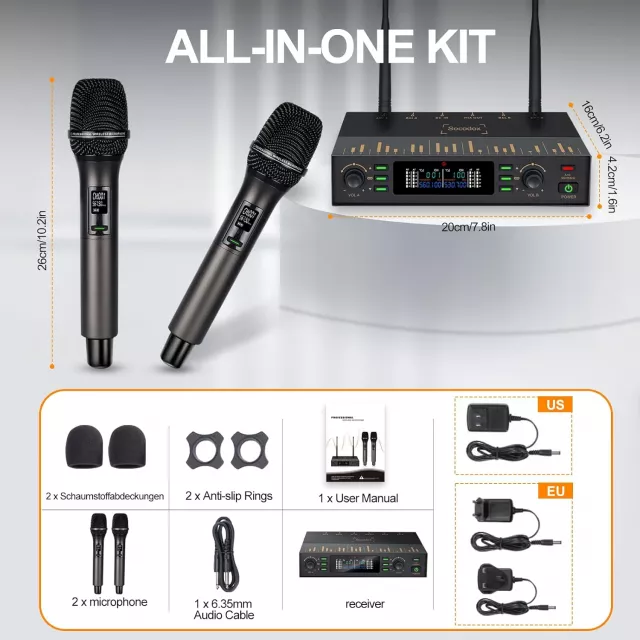 Each microphone is built with a premium cardioid dynamic core that captures your voice naturally while filtering out unwanted background noise. The advanced PRO-UHF transmission technology ensures stable, interference-free performance with an impressive range of up to 262 feet (80 meters). With one-click feedback suppression and customizable reverb control, you can fine-tune your sound in seconds for the perfect audio balance. Crafted from durable metal with a steel mesh grille, these mics are built to last through countless shows, rehearsals, and celebrations.