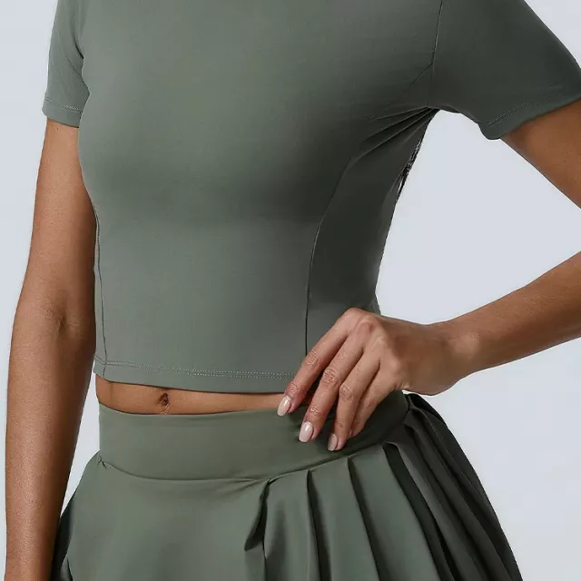 This short-sleeve performance tee is perfect for every season—spring, summer, autumn, or winter. Its breathable, moisture-wicking fabric keeps sweat at bay, while the quick-dry technology ensures you stay cool and fresh no matter how intense your workout gets. The anti-pilling and anti-wrinkle features maintain its smooth texture and shape after every wash, so you’ll always look polished, whether you’re training, dancing, cycling, or exploring the outdoors.